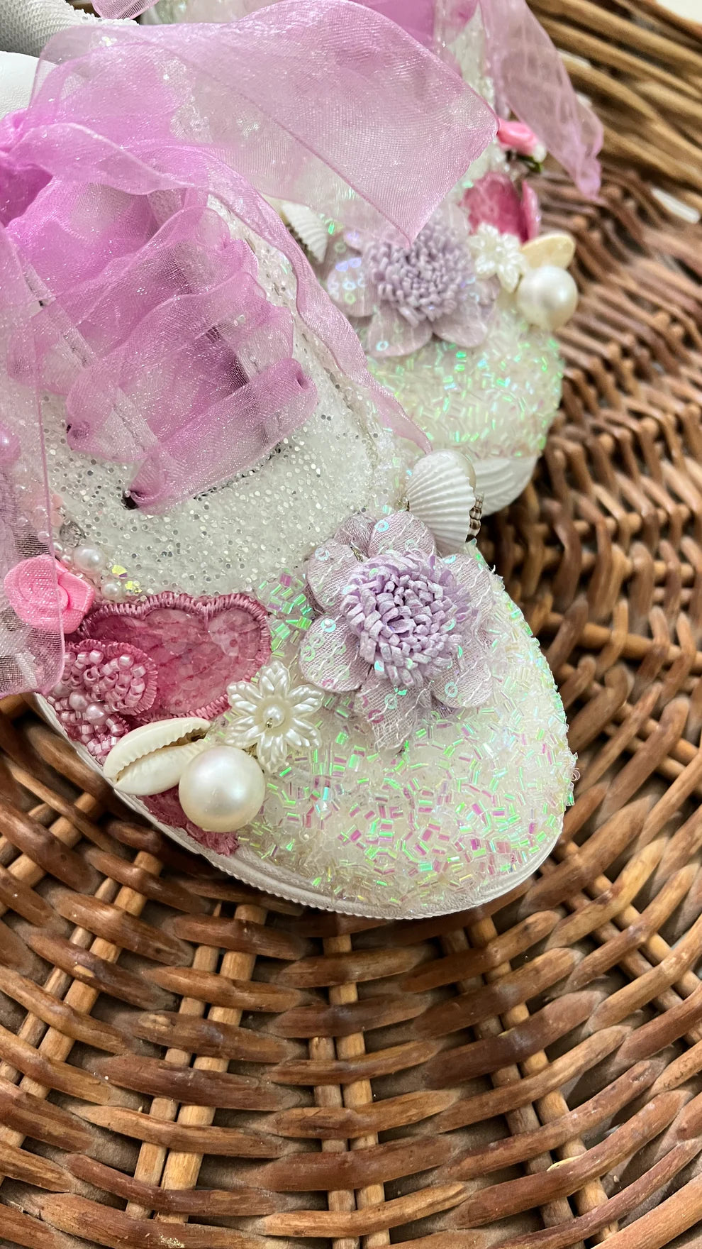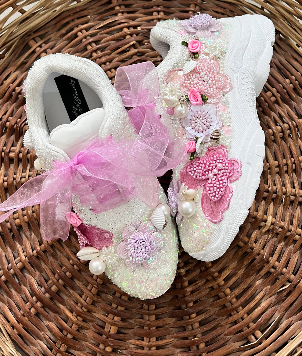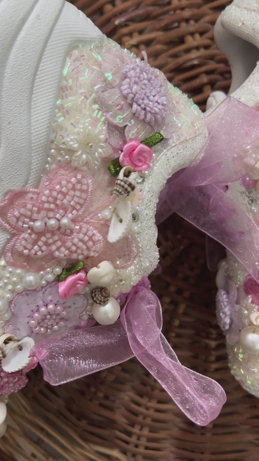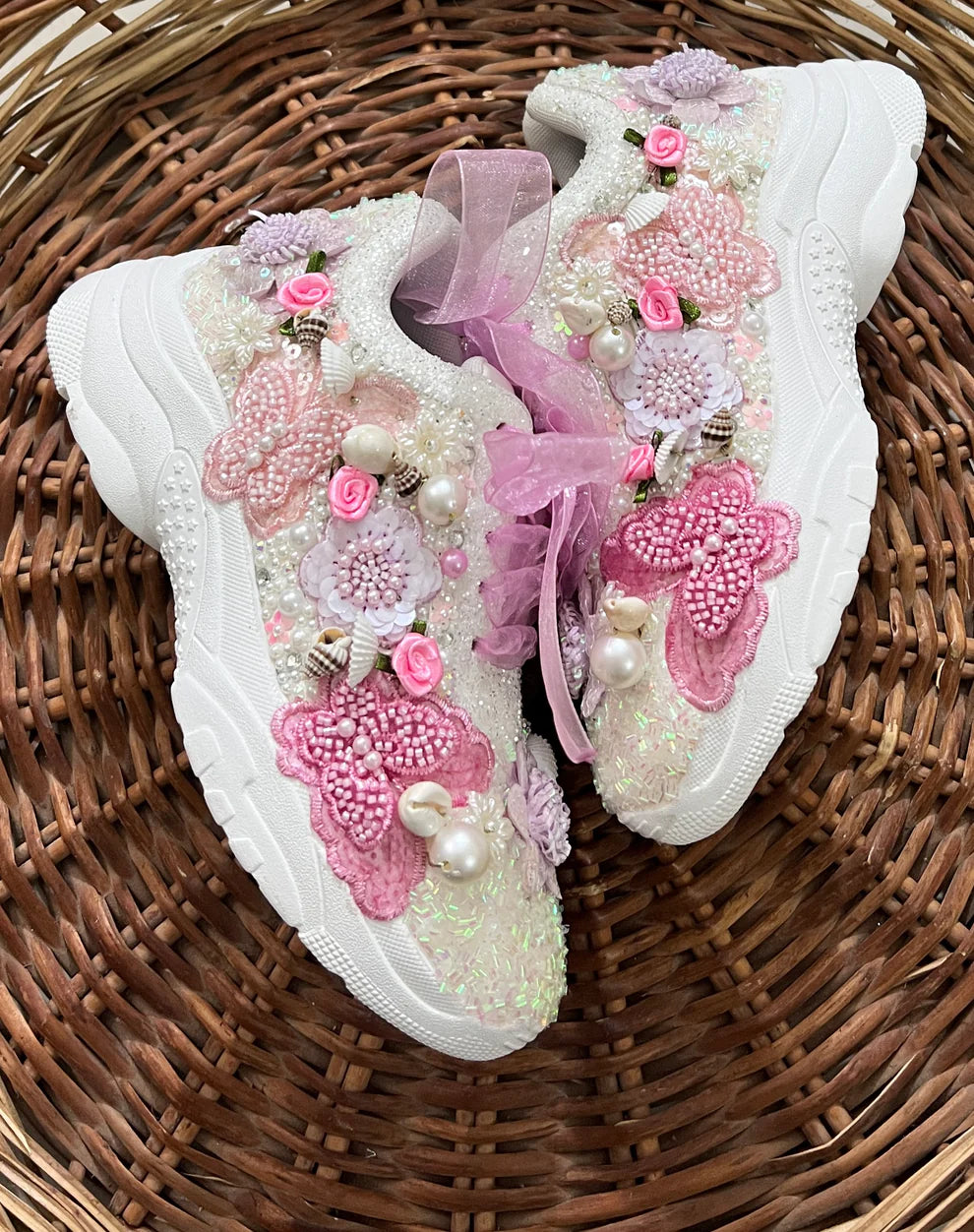 Make your wedding day magical with these enchanting handcrafted sneakers. Featuring delicate butterflies, floral designs, and shell & pearl embellishments in romantic pink, white, and lilac hues. Personalized with your couple's names for an extra special touch.