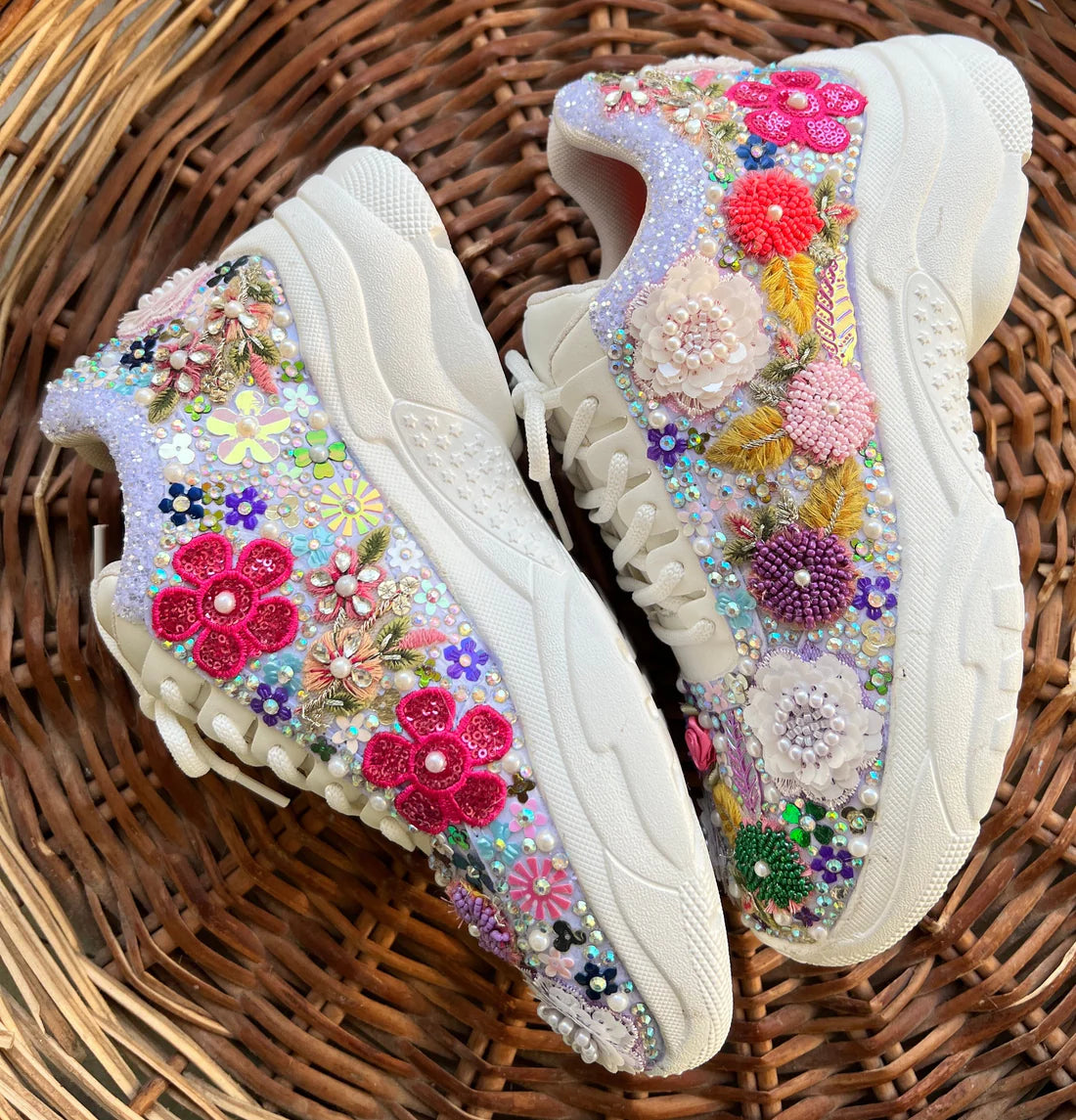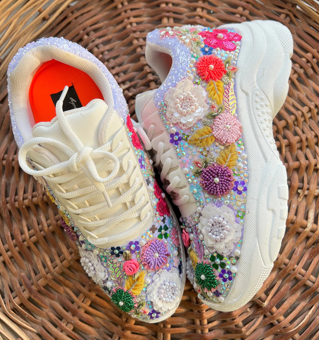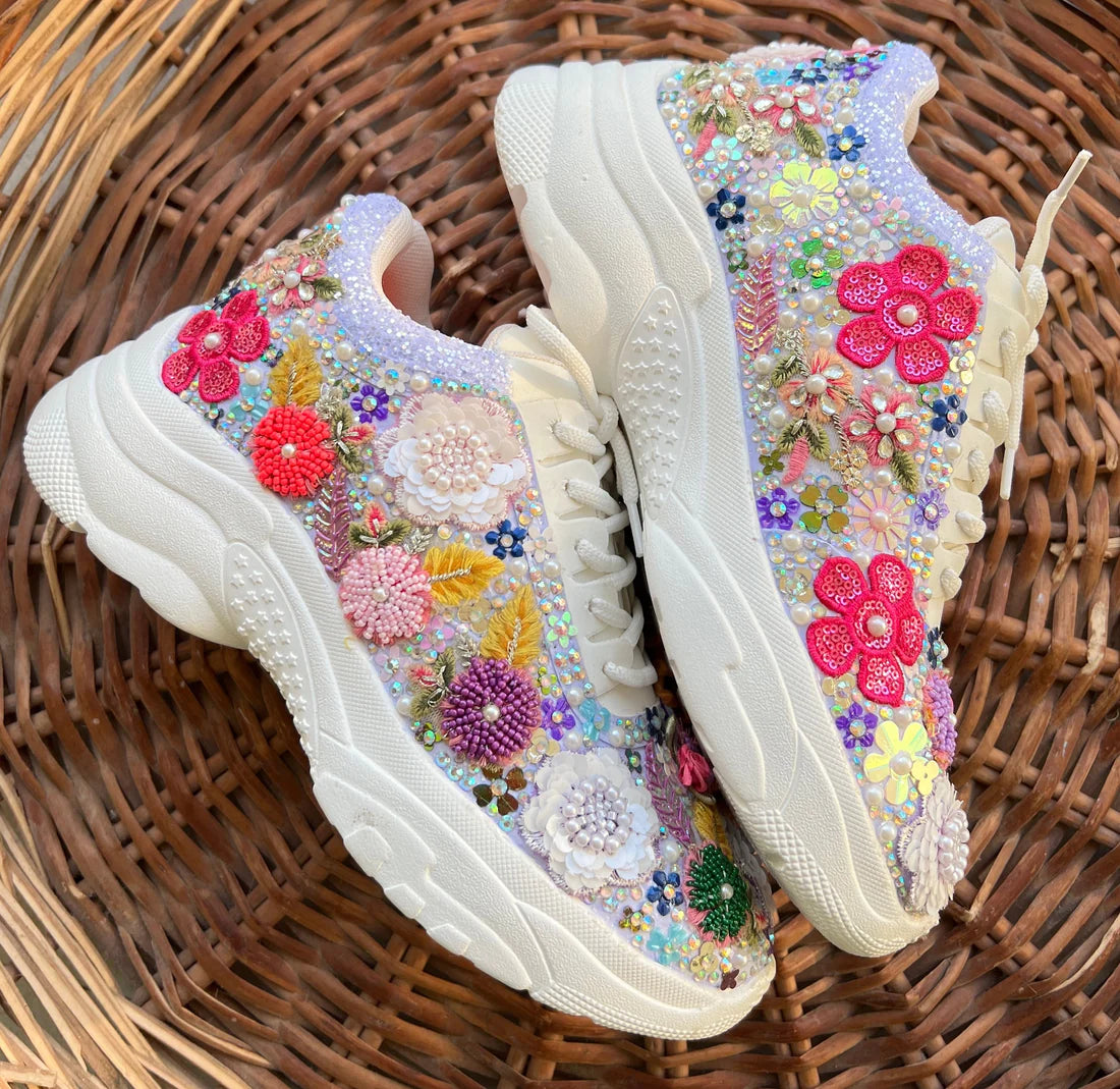 Step into your special day with these stunning handcrafted bridal sneakers. Each pair features intricate purple floral designs meticulously adorned with beads, rhinestones, and cutdana work. Perfect for brides seeking comfort without compromising on glamour, or bridesmaids looking to make a statement.