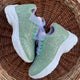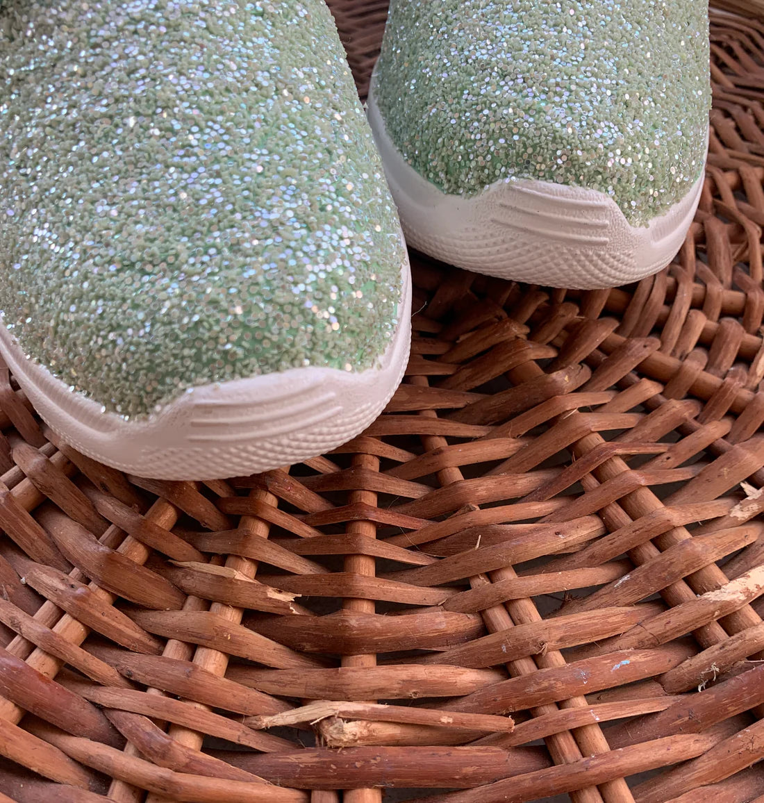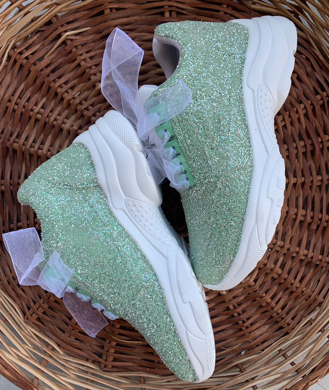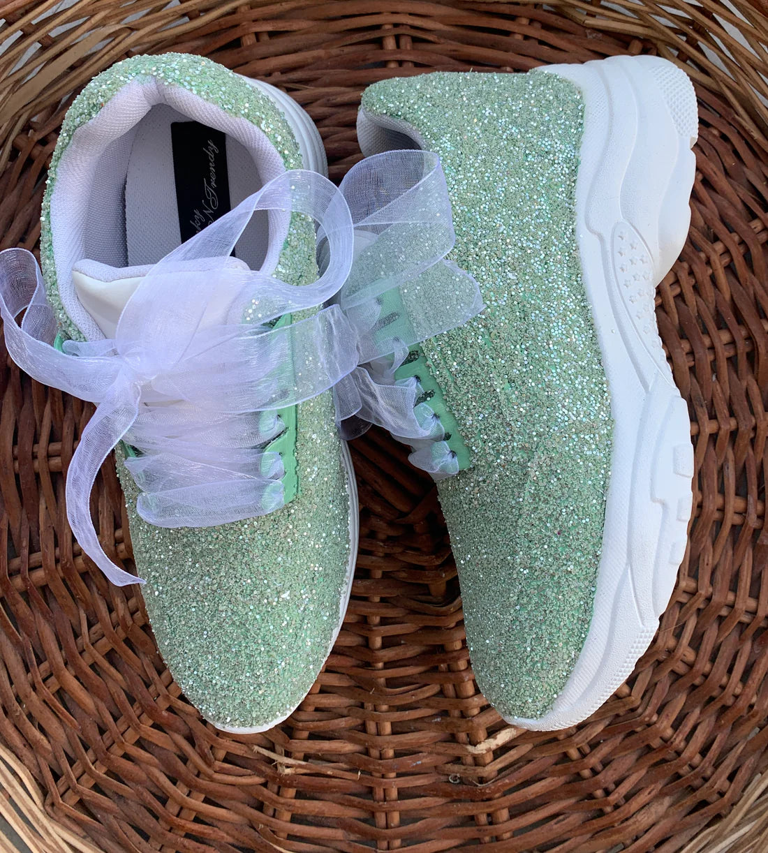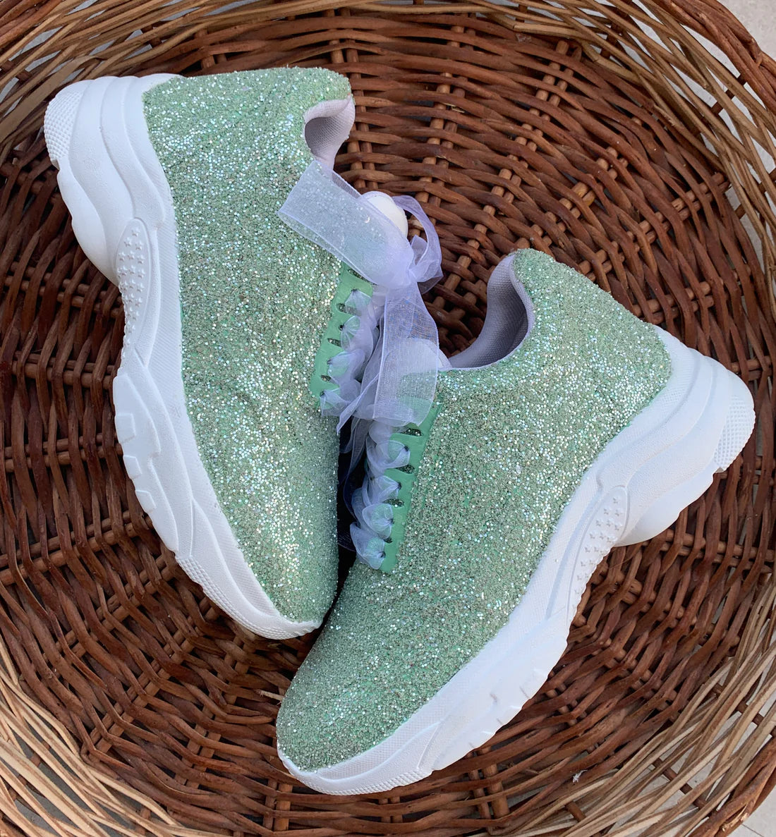 Sparkle in comfort with these handcrafted sage green glitter sneakers. Perfect for brides and bridesmaids seeking a blend of glamour and comfort on the special day.